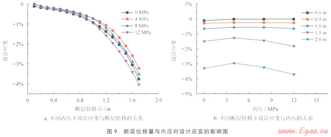 考慮0MPa、4MPa、8MPa、12MPa這4種不同內壓工況下設計應變的變化規(guī)律。由有限元結果可以得到,設計應變在不同內壓下隨斷層位移的變化規(guī)律比較類似(圖9)。為了進一步分析內壓對設計應變的影響,分析了不同斷層位移下設計應變隨內壓的變化情況。從圖9-b可以看出,當斷層位移量大于1m時,設計應變在4MPa時應變最?。划敂鄬游灰屏啃∮?/span>1m時,設計應變較小,不同內壓下設計應變的差距變得不大明顯。