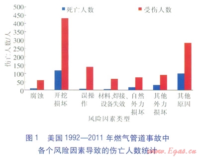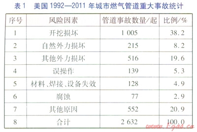 通過(guò)分析城市燃?xì)夤艿朗鹿式y(tǒng)計(jì)數(shù)據(jù),將管道面臨的風(fēng)險(xiǎn)因素分為7個(gè)大類(lèi),從管道事故發(fā)生可能性和管道事故后果兩個(gè)方面進(jìn)行分析。以1992—2011年美國(guó)的燃?xì)夤艿朗鹿蕯?shù)據(jù)為基礎(chǔ),確定了7類(lèi)風(fēng)險(xiǎn)因素的風(fēng)險(xiǎn)等級(jí)排序。城市燃?xì)夤艿老到y(tǒng)風(fēng)險(xiǎn)因素的等級(jí)排序依次為開(kāi)挖損壞,其他原因,其他外力損壞,自然外力損壞,誤操作,材料、焊接、設(shè)備失效,腐蝕。詳細(xì)分析了7大類(lèi)風(fēng)險(xiǎn)因素在城市燃?xì)夤艿廊粘_\(yùn)行管理中的表現(xiàn)形式,對(duì)于制定安全評(píng)價(jià)方法,提高安全管理水平具有積極意義。