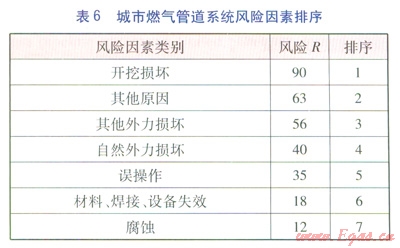 根據(jù)事故發(fā)生的可能性和后果評(píng)分結(jié)果,按照式(1)進(jìn)行計(jì)算,城市燃?xì)夤艿?/span>7類(lèi)常見(jiàn)風(fēng)險(xiǎn)因素排序見(jiàn)表6。