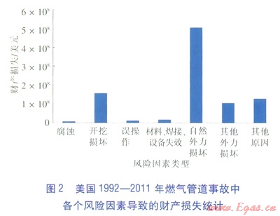 圖2顯示了美國(guó)1992—2011年燃?xì)夤艿朗鹿手懈鱾€(gè)風(fēng)險(xiǎn)因素導(dǎo)致的財(cái)產(chǎn)損失統(tǒng)計(jì),其中,自然外力損壞類(lèi)事故造成財(cái)產(chǎn)損失最多,為5.06×108美元;腐蝕類(lèi)事故造成的財(cái)產(chǎn)損失最小,為914.2×104美元。