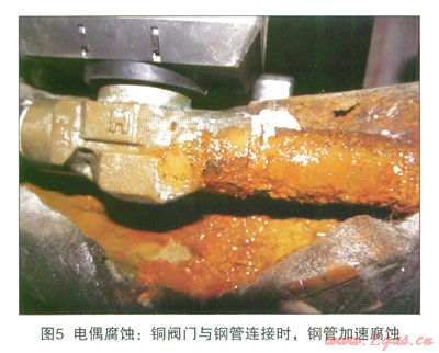 在金屬活動順序表中,Fe要比Cu活潑,在相同的環(huán)境中,Fe的電位要比Cu負。當異種金屬相接觸,處于相互連通的電解質(zhì)中時,由于不同金屬之間存在實際電位差而使電位較低的金屬腐蝕速度比原來增大,電位較高的金屬的腐蝕速度減小,這種現(xiàn)象稱為電偶腐蝕[4],見圖5所示。當鋼與銅相互接觸時,鋼的腐蝕速率比其單獨存在時加大。在閥門位置,利用銅包鋼或者銅網(wǎng)進行接地時,由于電偶腐蝕的作用,會加速閥門的腐蝕。同時由于銅的良好導電性和自腐蝕較低的特性,利用銅材質(zhì)進行接地時,接觸電阻要比閥門直接接地更低,在這種情況下,陰極保護電流集中流入流出的現(xiàn)象會更加嚴重。