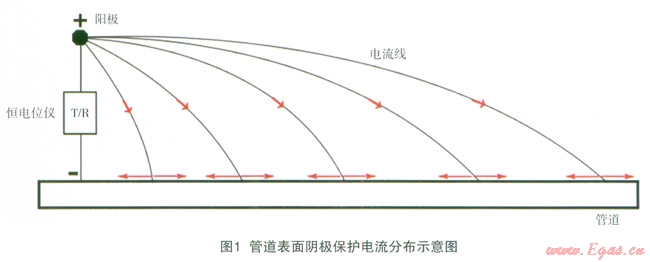 陰極保護系統(tǒng)電路路徑的構(gòu)成包括:土壤、管道、導線[2]。對于直流電路來說,根據(jù)歐姆定律可以知道,電路中的電流在流動過程中,電流會始終傾向于在電阻較小的路徑流動。當管道的防腐層面電阻率變化不大、防腐層沒有出現(xiàn)嚴重的破損點和接地的情況時,管道表面陰極保護電流的分布是相對較為均勻的,如圖1所示。