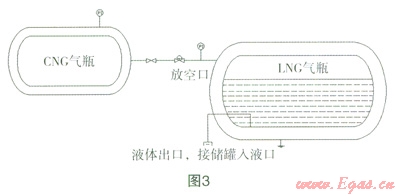 (2)LNG內膽主安全閥開啟壓力為1.59MPa(230psi),為了安全起見(調壓器會出現失效)CNG儲罐充裝壓力不能超過l.59MPa。把CNG與LNG瓶按圖3連接好后都要接上地線。
