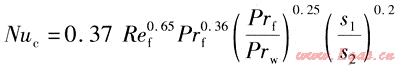 在設(shè)計(jì)過程中,傳熱系數(shù)的計(jì)算只能依靠經(jīng)驗(yàn)公式,對(duì)于流體橫掠光管和翅片管的情況都要考慮。光管管束的計(jì)算使用茹卡烏斯卡斯總結(jié)出的平均表面?zhèn)鳠嵯禂?shù)的關(guān)聯(lián)式[5],螺旋翅片和整體翅片管束分別使用Briggs和Young的關(guān)聯(lián)式和Gray和Webb關(guān)聯(lián)式[6]。