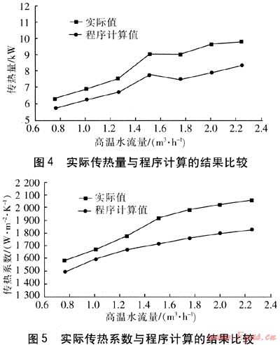 換熱器高溫水進(jìn)出口溫度與程序計(jì)算高溫水出口溫度見圖3。由圖3可知,當(dāng)高溫水流量在0.75~2.25m3/h變化時(shí),實(shí)測(cè)的高溫水出口溫度與程序計(jì)算值的變化趨勢(shì)基本是一致的,但實(shí)測(cè)值比程序計(jì)算值低,即換熱器的實(shí)際傳熱量比程序計(jì)算的高。