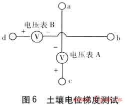 土壤電位梯度指土壤中電流流動(dòng)形成的電位差,可通過沿管道方向和垂直管道方向兩組參比電極電位差矢量和求得,測試接線見圖6。4只銅/飽和硫酸銅(Cu/CuS04)參比電極a、b、c、d;ac與bd垂直對稱布置且距離相等,其中ac與管道平行且電極間距宜為100m,當(dāng)受到環(huán)境限制時(shí)可適當(dāng)縮短。電壓表所測得的Vac和Vbd除以電極間距,則得到與管道平行和與管道垂直方向的土壤電位梯度,其矢量和即為該點(diǎn)的土壤電位梯度。土壤電位梯度的大小可判定雜散電流大小,電位梯度方向與雜散電流方向相同。