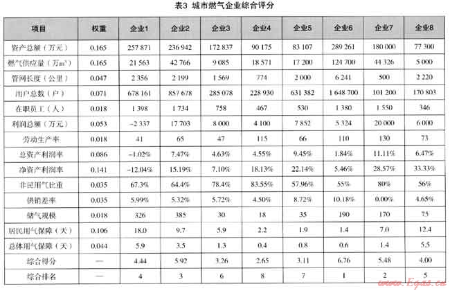 根據(jù)已經(jīng)建立的評價體系,我們對國內(nèi)12家運(yùn)營較規(guī)范燃?xì)馄髽I(yè)進(jìn)行了調(diào)研,并從中選擇數(shù)據(jù)反饋完整的8家企業(yè)進(jìn)行比較。根據(jù)8家企業(yè)經(jīng)營指標(biāo)(截止至2010年底)的相對優(yōu)劣,分別計算每個企業(yè)每個項目得分(0分-10分),各項加權(quán)匯總后為企業(yè)綜合得分。(見表3)
