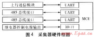采集器的任務(wù)就是轉(zhuǎn)發(fā)集中器和燃氣表之間的通信數(shù)據(jù),并在抄讀燃氣表的時候短暫地給燃氣表的電子部分供電。采集器和集中器之間的通信采用了電力線載波通信方式。電力線載波通信有通信不穩(wěn)定、易受干擾的缺點,但采集器只要在軟件上做些改進就能極大地彌補這一缺點,例如能短時間地儲存燃氣表的數(shù)據(jù)。這樣當給集中器返回的燃氣表數(shù)據(jù)因信道不穩(wěn)定而丟失時,集中器再次下發(fā)抄這塊表的數(shù)據(jù)時,采集器就不用再去抄燃氣表了,而是很快地直接返回采集器儲存的數(shù)據(jù),這樣就使抄表成功率大大提高。采集器也要求采用可更換的通信模塊,儲存容量不需要太大,采集器MCU要有至少3個UART,還要有給燃氣表供電單元。采集器的硬件框圖見圖4。MCU的1個UART和上行通信模塊相連,2個UART設(shè)計成RS485總線。這2個RS485接口,1個是和燃氣表通信用,1個保留和集中器通信。如果采集器和集中器距離很近,就用保留的RS485接口直接和集中器相連。同時MCU控制1個繼電器給直讀式燃氣表的電子部分供電。