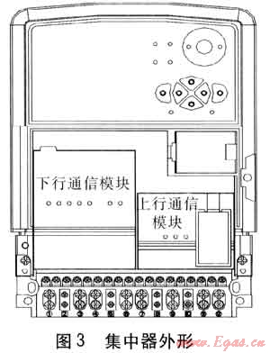 集中器外殼選用國家電網(wǎng)公司企業(yè)標準Q/GDW 375.2—2009《電力用戶用電信息采集系統(tǒng)型式規(guī)范:集中器型式規(guī)范》中的集中器外殼。外形見圖3??梢钥吹?,這個外殼上面有上行通信模塊和下行通信模塊兩個小盒子,這兩個小盒子采用了可插拔設(shè)計。左邊小盒子是和采集器通信的通信模塊,右邊小盒子是和主站通信的通信模塊。集中器在設(shè)計時先規(guī)定好集中器和這兩個通信模塊之間的通信協(xié)議和物理層的接口,所有通信模塊的設(shè)計都遵守這個協(xié)議。根據(jù)現(xiàn)場選擇通信方式的不同更換不同的通信模塊,這樣就大大提高產(chǎn)品的適應(yīng)能力。