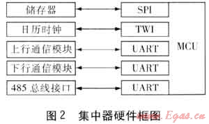 集中器的任務(wù)較多,主站抄讀實時數(shù)據(jù)時也要求集中器有一定的實時性要求,這就要求集中器中的微處理器(MCU)有較高的運算速率。集中器的通信接口較多,要求集中器至少有3個通用異步串行接口(UART):1個UART和上行通信模塊通信,1個UART和下行通信模塊通信,另1個UART設(shè)計成RS485接口,這個RS485接口主要用于當集中器和采集器距離很近時,集中器直接通過這個RS485接口和采集器直接通信,而不需要通過下行通信模塊了。集中器內(nèi)選擇同步串行接口(SPI)的儲存器,它具有接線少、儲存量大的優(yōu)點。MCU需要有至少1個SPI接口。集中器做日凍結(jié)數(shù)據(jù)和月凍結(jié)數(shù)據(jù)時所需要的日歷時鐘大多采用兩線制串行接口(TWI),這就需要MCU要有TWI接口。隨著電子技術(shù)和計算機通信技術(shù)的發(fā)展,能實現(xiàn)這樣功能的MCU有很多。集中器設(shè)計時還要內(nèi)置防雷器件。集中器硬件框圖見圖2。