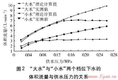 ② 在相同供水壓力下,“大水”檔位的體積流量較大,主要是因?yàn)?ldquo;大水”檔位的局部阻力比“小水”檔位的局部阻力小,即水量調(diào)節(jié)閥是通過調(diào)節(jié)局部阻力來調(diào)節(jié)流量的。