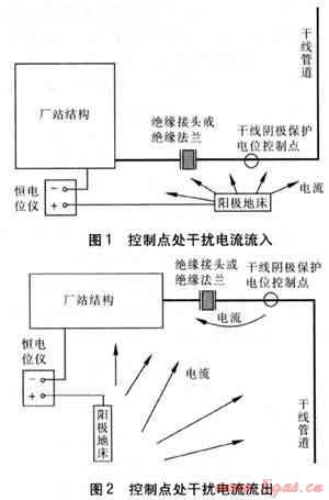 站內(nèi)陰極保護(hù)電流一般通過影響站外干線陰極保護(hù)系統(tǒng)控制點(diǎn)來對(duì)其造成干擾。由于國(guó)內(nèi)大多數(shù)干線管道陰極保護(hù)系統(tǒng)采用恒電位控制方式,而電位信號(hào)反饋點(diǎn)即陰極保護(hù)電位控制點(diǎn)通常距離站內(nèi)金屬結(jié)構(gòu)較近,因此易受到站內(nèi)陰極保護(hù)系統(tǒng)的影響,引起極化增加或去極化而影響控制系統(tǒng)的信號(hào)反饋,從而使干線保護(hù)系統(tǒng)的輸出電流降低或增加,干線陰極保護(hù)水平相應(yīng)受到影響。通常干擾有兩種類型:一是控制點(diǎn)處有干擾電流流入,導(dǎo)致極化增加,見圖1,為維持設(shè)定的控制電位,干線陰極保護(hù)系統(tǒng)輸出電流將自動(dòng)下降,導(dǎo)致整個(gè)管道陰極極化程度降低,遠(yuǎn)端易保護(hù)不足;二是控制點(diǎn)處有干擾電流流出,導(dǎo)致極化減小,見圖2,為維持設(shè)定的控制電位,干線陰極保護(hù)系統(tǒng)輸出電流將自動(dòng)提高,導(dǎo)致整個(gè)管道陰極極化加大,近端易產(chǎn)生過保護(hù)。