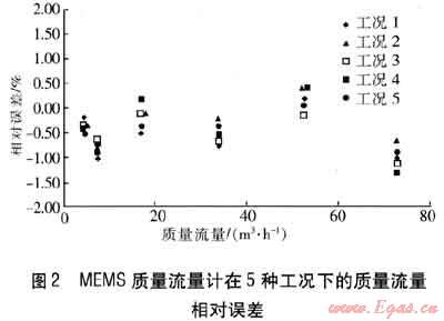經(jīng)實(shí)驗(yàn)確定,前直管段長度最小應(yīng)為前直管段內(nèi)直徑(D)的5倍。在前直管段的前端連接不同的彎管(包括90°垂直或水平彎管及其各類組合),得到5種工況下的計(jì)量相對誤差,見圖2。5種工況分別為:工況1:1個(gè)90°垂直彎管+長5D的前直管段;工況2:2個(gè)90°垂直彎管+長5D的前直管段;工況3:2個(gè)90°水平彎管+長5D的前直管段;工況4:1個(gè)90°水平彎管+1個(gè)90°垂直彎管+長5D的前直管段;工況5:長15D的前直管段。由圖3可知,只要前直管段長度大于等于5D,各類彎管對MEMS質(zhì)量流量計(jì)的精度影響很小。
