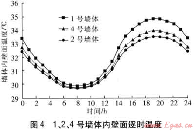 在同一溫度波的連續(xù)作用下,1、2、4號墻體內(nèi)壁面逐時溫度見圖4。由表3、圖4可知,1號墻體內(nèi)壁面平均溫度比2號墻體高約0.8℃,比4號墻體高約0.5℃。對比墻體傳熱系數(shù),1號墻體的傳熱系數(shù)明顯高于2、4號墻體。因此,墻體傳熱系數(shù)越大,內(nèi)壁面溫度越高。