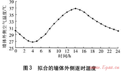 b. 墻體外側(cè)空氣溫度呈簡諧波規(guī)律變化,本文選取武漢作為夏熱冬冷地區(qū)的典型城市進行分析,利用武漢夏季某典型日的室外空氣溫度[15]。進行計算,擬合的墻體外側(cè)逐時溫度見圖3。