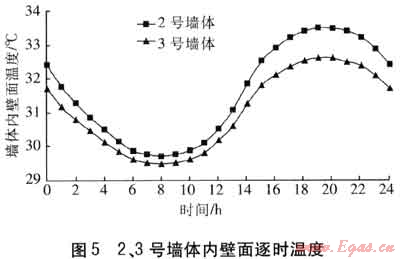 對比采用不同絕熱材料和絕熱形式的墻體。2號墻體采用30mm厚EPS板的外保溫形式,3號墻體采用190mm厚混凝土空心砌塊(內(nèi)填膨脹珍珠巖)的自保溫形式。2、3號墻體的衰減度分別為35.68、64.73。在同一溫度波的連續(xù)作用下,2、3號墻體內(nèi)壁面逐時溫度見圖5。由圖5可知,3號墻體的內(nèi)壁面溫度低于2號墻體,因此衰減度大的墻體,內(nèi)壁面溫度較低。對于外保溫和自保溫墻體,宜考慮采用衰減度大的自保溫墻體。但既有建筑進行自保溫改造困難較大,因此自保溫更適用于新建建筑。