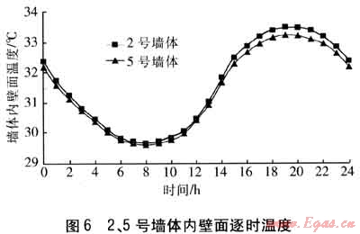 對比不同厚度絕熱材料的外保溫墻體。2號墻體采用30mm厚EPS板作為絕熱材料,5號墻體采用50mm厚EPS板作為絕熱材料。2、5號墻體的衰減度分別為35.68、47.26。在同一溫度波的連續(xù)作用下,2、5號墻體內(nèi)壁面逐時溫度見圖6。由圖6可知,5號墻體的內(nèi)壁面溫度波動范圍小于2號墻體,且前者內(nèi)壁面溫度低于后者。因此衰減度大的墻體內(nèi)壁面溫度更低,熱穩(wěn)定性更好。但2號與5號墻體內(nèi)壁面溫度差別不大,因此隨著絕熱材料厚度的增加,絕熱效果改善不明顯。