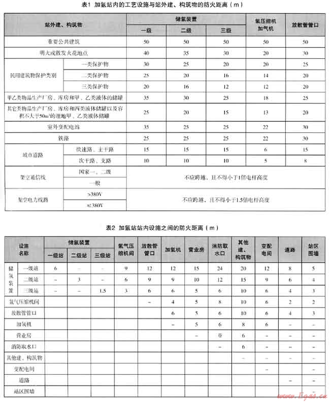 加氫站是甲類火災危險眭設施,必須在設計上保證其安全可靠。在加氫站進行站址選擇和站內(nèi)建、構筑物及設備平面布局設計時,必須符合上海市城市規(guī)劃和站區(qū)防火安全的要求,參照上海市地方規(guī)范《燃料電池汽車加氫站技術規(guī)程》,確保加氫站與站外重要公共建筑物、明火或散發(fā)火花地點、民用建筑和廠房、庫房、儲罐、鐵道、鐵路、架空通信線、架空電力線路等保持足夠的防火距離滿足表1的要求。