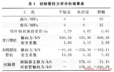 通過以上敏感性分析,設(shè)計(jì)1.7m伸縮短接便可有效補(bǔ)償擠酸工況管柱變形附加力。以下對(duì)安裝伸縮短接后的管柱進(jìn)行力學(xué)分析和強(qiáng)度校核,結(jié)果見表2。
