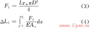 對(duì)于帶封隔器井下管柱,隨著井筒壓力、溫度等參數(shù)變化而產(chǎn)生溫度效應(yīng)、活塞效應(yīng)、鼓脹效應(yīng)、螺旋彎曲效應(yīng)。對(duì)這4個(gè)基本效應(yīng)產(chǎn)生的管柱變形及其變形力,國內(nèi)外學(xué)者已經(jīng)做了大量研究,此不贅述。對(duì)于深層氣井,高速擠酸過程中,流體粘滯摩阻效應(yīng)是引起管柱變形的重要因素,也是造成管柱、封隔器失效的主要原因。因此,在分析管柱變形時(shí)除了要考慮上述4種基本效應(yīng)外,還必須考慮流體粘滯摩阻效應(yīng),粘滯摩阻力(Ff)和摩阻效應(yīng)變形(△Lf)分別由下式表示[7~8]: