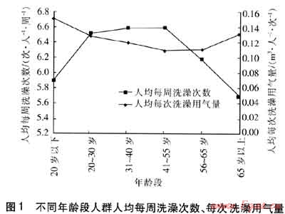 不同年齡段人群人均每周洗澡次數(shù)、人均每次洗澡用氣量見圖1。由圖1可知,對(duì)于不同年齡段人群,人均每周洗澡次數(shù)曲線呈兩邊低中間高的形態(tài),20~55歲年齡段的人群洗澡比較頻繁,65歲以上年齡段人群人均每周洗澡次數(shù)最低,這也與該年齡段的生理狀況有關(guān)。人均每次洗澡用氣量曲線呈中間低兩邊高相態(tài),由此可知,洗澡次數(shù)越頻繁,每次洗澡用氣量越小。
