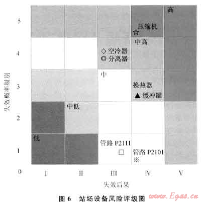 2) 注采氣站風險評估結(jié)果表明:壓縮機系統(tǒng)和處理系統(tǒng)風險遠遠大于管路系統(tǒng)風險,其中壓縮機組最大;處理系統(tǒng)設備中空冷器風險最大,其次是緩沖罐(壓縮機出口)、過濾分離器和旋流分離器(圖5);而管路系統(tǒng)中對帶壓的34條管線中,從壓縮機出口到緩沖罐出口的管線P2112~P2118風險最大,其中P2113最大,管路系統(tǒng)風險值大主要是由于壓力和溫度相對較高引起的。采用風險矩陣對各類設備或管路風險定級可知:壓縮機風險為高風險,而管路系統(tǒng)均為中低風險(圖6)。通過風險排序,明確了高風險單元,即可采用HAZOP法進行詳細風險分析。