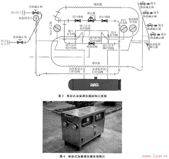 根據(jù)以上分析可知,由于LNG鋼瓶組為現(xiàn)成的外接設(shè)備,小型移動式天然氣臨時供應(yīng)裝置的設(shè)計關(guān)鍵就是集增熱、調(diào)壓及加臭于一體的橇裝設(shè)備的設(shè)計,這里將其定義為移動式加臭調(diào)壓箱,其結(jié)構(gòu)示意圖如圖3所示。