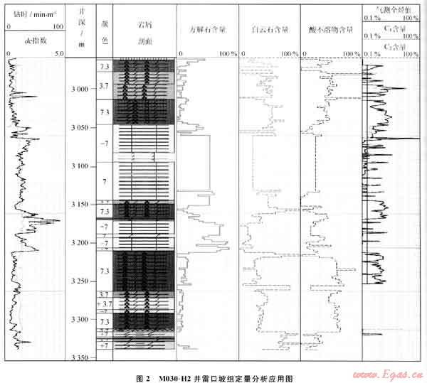 針對碳酸鹽巖地層,顯微識別定量分析巖性存在困難,應(yīng)用碳酸鹽巖定量分析技術(shù),對M030-H2井進(jìn)行分析,在2961~3046m、3148~3164m、3208~3308m儲層段,顯示方解石含量低,白云石含量高,對應(yīng)綜合錄井參數(shù)為低鉆時(shí),高氣測值段。證實(shí)碳酸鹽巖定量分析獲得的方解石、白云石、酸不溶物含量與巖屑剖面、鉆時(shí)、氣測等資料對比吻合性較好,快速識別出白云巖儲層(圖2)。