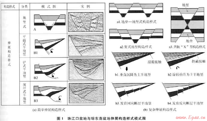 2) 受盆地動(dòng)力學(xué)機(jī)制影響,盆地構(gòu)造樣式可以劃分為伸展構(gòu)造樣式、走滑構(gòu)造樣式及重力構(gòu)造樣式。每一種構(gòu)造樣式均反映了不同的動(dòng)力學(xué)背景。其中伸展構(gòu)造樣式在盆地內(nèi)占主要地位,走滑構(gòu)造樣式及重力構(gòu)造樣式主要分布于盆地局部。