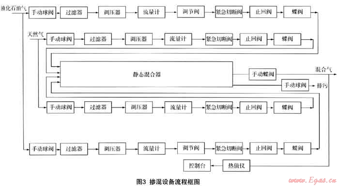 混合天然氣和LPG分別經(jīng)計量調(diào)壓后同時進入混合器,混合器中設置了折流板和旋轉板,兩種氣體在混合器中經(jīng)過多次折返、旋轉流動,最后達到95%以上的混合效率。調(diào)節(jié)系統(tǒng)主要由一臺設在LPG回路的氣動薄膜調(diào)節(jié)閥和相關控制部件組成,由控制系統(tǒng)根據(jù)天然氣的流量或混合氣的熱值自動控制調(diào)節(jié)閥的開度,從而實現(xiàn)對LPG進入混合器流量的調(diào)控,達到設定的華白指數(shù)。