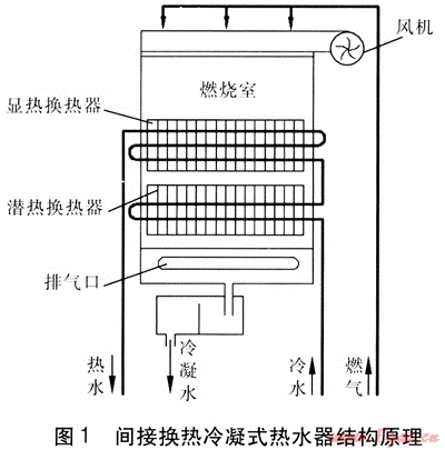 這種換熱方式采用間壁式換熱器進行換熱,高溫煙氣通過間壁式換熱器加熱水。目前國內(nèi)市場上的冷凝式熱水器大多采用這種形式。其結(jié)構(gòu)原理見圖1。
