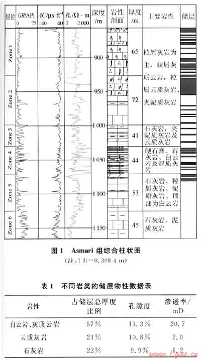 根據(jù)測(cè)井解釋(表1),白云巖類儲(chǔ)層所占比例高,孔隙度、滲透率高,物性好,是主要的儲(chǔ)集巖類,這與MIS構(gòu)造Asmari組主要為石灰?guī)r儲(chǔ)層的傳統(tǒng)認(rèn)識(shí)有差別[1]。