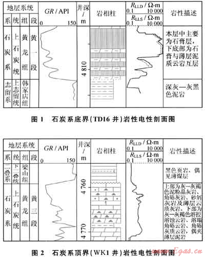 志留系與石炭系在巖性及電測(cè)曲線上均易于劃分。其上下地層的巖性和電性差異較為明顯。從巖性上看,C2hl底部以石膏夾薄層泥質(zhì)云巖互層,韓家店組深灰-灰黑色泥巖為主。從電性上看,C2hl對(duì)應(yīng)的測(cè)井曲線反映為較低GR值、較高RLLD和RLLS值,與下伏志留系地層區(qū)別明顯(圖1)。