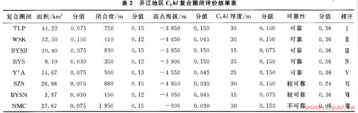 C2hl及其上、下巖層的組合是四川盆地多套生、儲(chǔ)蓋組合中較好的一套組合,經(jīng)過(guò)多年的勘探也證實(shí)C2hl具有豐富的天然氣資源。結(jié)合已發(fā)現(xiàn)C2hl氣藏特征對(duì)已識(shí)別C2hl復(fù)合圈閉面積進(jìn)行劃分,圈閉面積小于10km2的權(quán)值取0.2,圈閉面積大于50km2的取權(quán)值1.0,圈閉面積介于10~50km2的取權(quán)值0.5,圈閉面積評(píng)價(jià)系數(shù)權(quán)重為O.15(表1)。