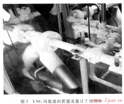 LNG流量計(jì)是整個(gè)LNG加氣機(jī)的核心部件。流量計(jì)的選型直接影響LNG加氣機(jī)的性能。根據(jù)以往石油和天然氣貿(mào)易交接應(yīng)用中所用的流量計(jì)量方法,最合理的LNG流量測(cè)量計(jì)包括:差壓(孔板式)流量計(jì)、渦輪流量計(jì)、超聲波流量計(jì)和科里奧利質(zhì)量流量計(jì),其中差壓流量計(jì)和渦輪流量計(jì)是得到公認(rèn)的傳統(tǒng)技術(shù),但用其來(lái)測(cè)量低溫的LNG時(shí)卻存在一些困難:差壓裝置和渦輪流量計(jì)都會(huì)使流量管內(nèi)的壓力大大降低,這可能導(dǎo)致LNG氣化;差壓流量計(jì)還要求管道上游和下游為長(zhǎng)距離直線型布局,計(jì)量的流量范圍不廣。而超聲波流量計(jì)和科里奧利質(zhì)量流量計(jì)被視為新技術(shù),得到了美國(guó)石油學(xué)會(huì)(API)、美國(guó)天然氣協(xié)會(huì)(AGA)和國(guó)際法制計(jì)量組織(OIML)的認(rèn)可,但在LNG貿(mào)易交接過(guò)程中使用超聲波流量計(jì)仍存在一些問(wèn)題,而科里奧利質(zhì)量流量計(jì)是目前應(yīng)用最成功的LNG流量計(jì)。圖2所示的即為使用中的LNG科里奧利質(zhì)量流量計(jì)。目前,美國(guó)艾默生旗下的高準(zhǔn)公司生產(chǎn)的CMF系列質(zhì)量流量計(jì)和Endress+Hauser公司生產(chǎn)的83F低溫型質(zhì)量流量計(jì)以其耐低溫和性能穩(wěn)定的優(yōu)點(diǎn)得到了LNG加氣機(jī)行業(yè)的認(rèn)同。但是,LNG加氣機(jī)在加液過(guò)程中難免會(huì)發(fā)生LNG的部分氣化,氣液兩相的存在對(duì)科里奧利質(zhì)量流量計(jì)的計(jì)量精度影響很大,其中氣相流量計(jì)量的準(zhǔn)確性對(duì)加氣機(jī)計(jì)量精度有著至關(guān)重要的影響,目前科里奧利質(zhì)量流量計(jì)液相計(jì)量的精度可達(dá)±0.10%,而氣相計(jì)量的精度只有±0.35%,這是需要進(jìn)一步解決的技術(shù)難題[4]。