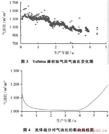 某些凝析氣藏在形成時,由于自然對流和熱擴散的作用[5],導(dǎo)致流體重組分含量隨深度的增加而減小,即氣藏頂部的流體最重,隨深度的增加,重組分含量逐漸減小,如日本的Yufutsu凝析油氣田。該氣田部分直井選擇在儲層的下部進行射孔,這就造成剛開始生產(chǎn)時的流體較輕,氣油比較高,而隨著開采的繼續(xù),將采出更多的淺層較重的凝析氣,這就造成生產(chǎn)氣油比的下降(圖3)。