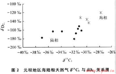 根據(jù)前人對甲烷氫同位素的研究,通常認(rèn)為烷烴氣的氫同位素首先制約于沉積環(huán)境,其次才是成熟度的影響。Schoell提出天然氣氫同位素組成隨烴源巖熱演化程度的增加變重,陸相淡水環(huán)境生成的熱成因甲烷的氫同位素組成小于-190‰,海相環(huán)境生成的甲烷的氫同位素組成大于-190‰[1]。沈平等研究發(fā)現(xiàn)中國陸相盆地天然氣甲烷的氫同位素組成介于-255‰~-158‰,其中海陸交互相的半咸水環(huán)境中生成的甲烷氫同位素值(δD)亦大于-190‰,而湖相、沼澤相的淡、微咸水環(huán)境生成的生物甲烷δD值一般小于-200‰[2~5]。王曉峰等對塔里木盆地海相和陸相環(huán)境生成的天然氣甲烷氫同位素進(jìn)行研究后發(fā)現(xiàn),二者基本以-170‰為界[3~6]。錢志浩等認(rèn)為,四川盆地天然氣由于成熟度和共存水的影響,海陸相天然氣甲烷8D的劃分界限以-160‰為宜[6]。