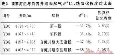 總體上,自流井組珍珠沖段、東岳廟段及大安寨段天然氣組分特征與須家河組相比較具有干燥系數(shù)低、重?zé)N含量高的特點,且自流井組天然氣甲烷碳同位素值比須家河組更輕,由化驗分析結(jié)果結(jié)合地質(zhì)特征,自流井組天然氣熱演化程度比須家河組要低(表3)。例如,YB03井東岳廟段(4035~4110m)天然氣組成中甲烷含量為91.79%,重?zé)N含量為6.257%,干燥系數(shù)C1/C1-5=0.936,屬于偏干的濕氣,相當(dāng)于高成熟階段天然氣。天然氣甲、乙、丙烷系列碳同位素值依次變重,且甲烷碳同位素值相對較輕,反映原地生成而且具有全捕獲的特征,也即聚集了低演化至目前高成熟階段的全系列天然氣,具有典型原地成藏的天然氣地球化學(xué)特征(表1、2)。