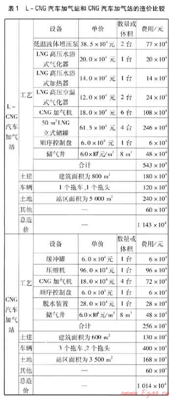 L-CNG汽車加氣站和CNG汽車加氣站的造價(jià)比較見表1。