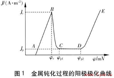 圖1為典型的鈍性金屬鈍化過程的陽極極化曲線。圖1中,橫坐標(biāo)表示陽極極化電位φ(單位為mV),縱坐標(biāo)表示電流密度1,(單位為A/m2),AB段金屬發(fā)生活性溶解,稱為活化區(qū),在A點,金屬為自然腐蝕狀態(tài),在靠近曰點附近,電極極化過程受到阻礙,可能產(chǎn)生氧化物的薄膜;在BC段,保護膜的生長速度已超過化學(xué)溶解速度,形成保護膜,這一區(qū)稱為鈍化過渡區(qū),到C點時,整個表面已被吸附氧化膜所覆蓋;在CD段,陽極電流與電位往往沒有關(guān)系,這一區(qū)為穩(wěn)定狀態(tài),稱為穩(wěn)定鈍化區(qū)。隨著電位的升高,膜中氧的含量增加,膜隨之變厚;在DE段,D點的電位相當(dāng)于氧的陽極析出電位,氧化膜被氧化成可溶性的高價氧化物,金屬又開始溶解,這一區(qū)域稱為過鈍化區(qū)。