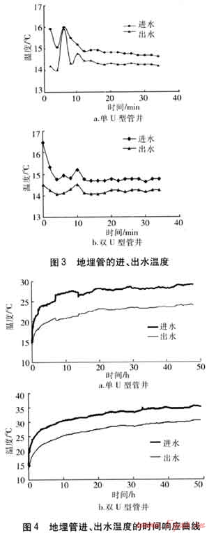 對單U型管井和雙U型管井均進(jìn)行了熱響應(yīng)測試。測試時保持每口井的加熱功率和供水流量穩(wěn)定,分別記錄48h的進(jìn)、出水溫度。進(jìn)、出水溫度的時間響應(yīng)曲線見圖4。由圖4可知,經(jīng)過一段時間后,地埋管的進(jìn)、出水溫差基本穩(wěn)定,表明地下?lián)Q熱已基本達(dá)到了平衡。此時計算得單、雙U型管的平均換熱量分別為47.59、86.44W/m。
