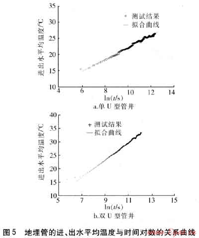 待地埋管進(jìn)、出水溫差穩(wěn)定后,擬合其平均溫度Tf與時間對數(shù)㏑t的關(guān)系曲線,見圖5。單U型管井?dāng)M合曲線公式為Tf=1.866 8㏑t+4.0142,雙U型管井?dāng)M合曲線公式為Tf=3.1964㏑t-5.5206,可得擬合曲線的斜率和截距。
