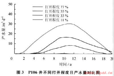數(shù)值模擬研究結(jié)果表明:當(dāng)打開11%時(shí),由于氣層上部位置主要為Ⅲ類儲(chǔ)層,物性差,氣井生產(chǎn)基本不見水,但穩(wěn)產(chǎn)期不足3a。當(dāng)打開33%、55%、77%時(shí),見水時(shí)間分別為5.2a、3.5a、1.4a,無水期采出程度分別為15.1%、8.8%、6.2%;當(dāng)打開程度大于77%時(shí),由于氣層中、下部位置多為Ⅱ類儲(chǔ)層,且局部發(fā)育裂縫,儲(chǔ)層物性較好,開發(fā)過程中邊水將快速推進(jìn)。可見,隨著P106井氣層打開程度的不斷增加,無水采氣期將逐漸縮短,相應(yīng)的無水期采出程度將逐步降低,而穩(wěn)產(chǎn)期因多因素影響將發(fā)生由低到高然后降低的變化。由此認(rèn)為,P106井氣層自上而下打開程度控制在55%左右為最優(yōu)[6](圖3)。