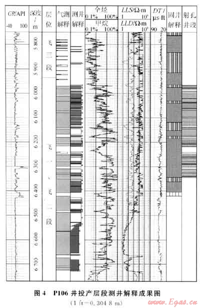 根據(jù)數(shù)值模擬評(píng)價(jià)結(jié)果,選取避射氣層下部6350.9~6529.0m井段,避射厚度斜深178.1m。同時(shí)考慮到飛三段解釋的12.1m/5層氣層分散在50m跨度范圍內(nèi),不利于投產(chǎn)作業(yè)施工,全部避射。最終優(yōu)選飛一、二段上部5966.3~6344.8m井段投產(chǎn),井段跨度378.5m,累計(jì)射孔厚度226.6m。P106井氣層的實(shí)際打開程度為50.6%。