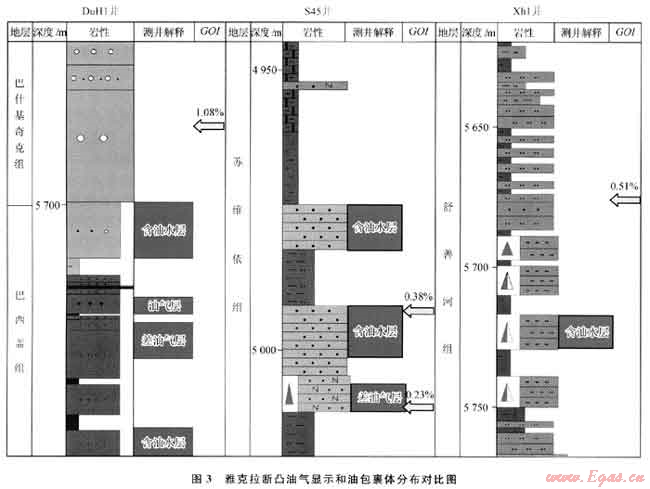 結(jié)合該區(qū)大量鉆井資料和流體包裹體系統(tǒng)檢測發(fā)現(xiàn),存在“斷接式”輸導(dǎo)體系的井區(qū)宏觀油氣顯示和微觀有機(jī)包裹體豐度(GOI,即賦存于有機(jī)包裹體的石英顆粒在所有石英顆粒中所占的比值),相比于其他井普遍較好,如:S45井在N1s宏觀上為含油層系,微觀上檢測到發(fā)黃色熒光的油包裹體和大量發(fā)弱白色熒光的氣包裹體,GOJ值范圍為0.23%~0.38%;Xh1井K1s為差油氣層,微觀上在K1b檢測到大量發(fā)亮黃色、橙黃色和藍(lán)白色熒光的油包裹體,GOI值為0.51%;DuH1井K1b為較好的含油氣層,微觀上在K1s、K1b則同時檢測到大量發(fā)黃色熒光的油包裹體和發(fā)弱白色熒光的氣包裹體,GOI值為1.08%(圖3)。
