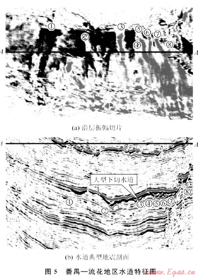 該區(qū)目前無鉆井鉆遇到該地質(zhì)體,但在該區(qū)東部,其水下水道的地震特征非常明顯:利用最新采集的3D地震資料,以精細(xì)的3D地震資料做基礎(chǔ),能夠清晰地觀察到水道的侵蝕、平面分布等特征。通過分析,發(fā)現(xiàn)了8條水道(圖5中①~⑧),自西向東依次排列,由北向南延伸,隨著坡度的逐漸減緩,在河道下方分別演化為扇狀朵體,并相互疊置(圖5-a)。這些水道在不同位置,其形態(tài)、寬度、長度都不同,但具有相似的地震相特征:地震同相軸呈點、段式反射,下切特征明顯,振幅中等-高(圖5-b)。通過這些水道下切形態(tài)、深度、地震反射特征和沉積厚度,可推測其形成于同一時期,且物源均來自于正北方向。
