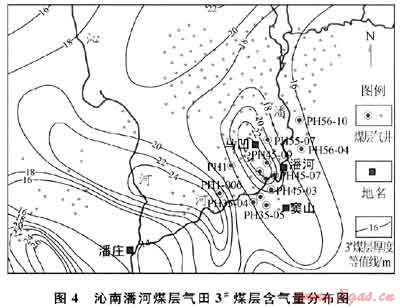 垂向上,下部15#煤層的含氣量明顯高于上部的3#煤層;平面上,3#煤層含氣量介于8~24m3/t,如圖4所示,以竇山東北、潘河口、馬凹為中心分別形成3個(gè)煤層氣富集區(qū),含氣量高達(dá)24m3/t,在潘河先導(dǎo)性試驗(yàn)區(qū)內(nèi)主要以潘河口為中心形成高含氣量區(qū),向外圍逐漸降低,在試驗(yàn)區(qū)的西北及西南方向先降低,后又逐步增高。
