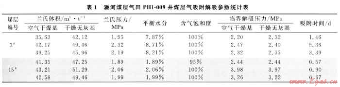 PH1-009井等溫吸附實(shí)驗(yàn)溫度采用儲(chǔ)層溫度,平衡水分條件,測試結(jié)果表明,區(qū)內(nèi)3#、15#煤層對(duì)甲烷具有很強(qiáng)的吸附能力。如表1所示,3#煤層蘭氏體積介于35.63~42.17m3/t,平均為39.02m3/t,蘭氏壓力介于1.95~2.32MPa;15#煤層蘭氏體積介于41.35~43.21m3/t,蘭氏壓力介于1.89~2.06MPa。15#煤層吸附能力高于3#煤層。吸附時(shí)間,3#煤層為3.39d,15#煤層為0.67d。煤層含氣飽和度均很高,除15#煤層的一個(gè)樣品為95%外,其余都是100%。