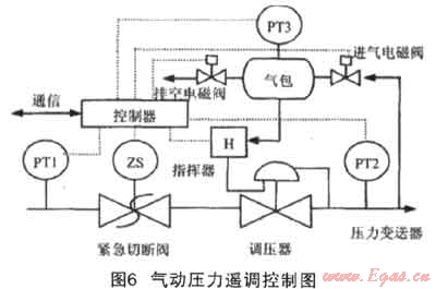 CS壓力遙調(diào)通過導(dǎo)壓管引入外部壓力,通過控制一個(gè)氣包的進(jìn)、出口電磁閥來調(diào)節(jié)氣包內(nèi)的壓力,進(jìn)而可以控制指揮器噴嘴噴出的燃?xì)鈮毫?,最終控制調(diào)壓器的出口壓力,如圖6[2]。
