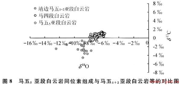 5) 大氣淡水與“富鎂鹵水”混合的白云巖化模式:由于大氣淡水的參與,在古隆起東側地區(qū)的馬五5沉積層中形成大氣淡水與“富鎂鹵水”的混合水帶,這種成巖介質環(huán)境對馬五5的白云巖化作用也會產生顯著的影響,主要表現在2個方面:①稀釋了“富鎂鹵水”,使成巖流體濃度降低,進而減少白云石結晶時的結晶中心形成總數(晶核形成數),這會使白云石生長更趨緩慢,結晶更趨自形、粗大;②使先成白云石重結晶。據Clyde Moore的研究認為[13],大氣淡水的參與會使先成白云石重結晶,并使其地球化學特征發(fā)生重組,這也會導致其晶體結構變粗和白云石自形程度的提高。對盆地古隆起東側馬五5白云巖的地球化學分析結果表明:馬五5白云巖有序度一般為0.85~0.95,尤其是其C—0同位素特征(δ13C:-0.79‰~0.07‰;δ18O:-7.1‰~-6.9‰),的確與馬五1+2蒸發(fā)潮坪形成的泥粉晶白云巖存在較大的差異(圖8)。
